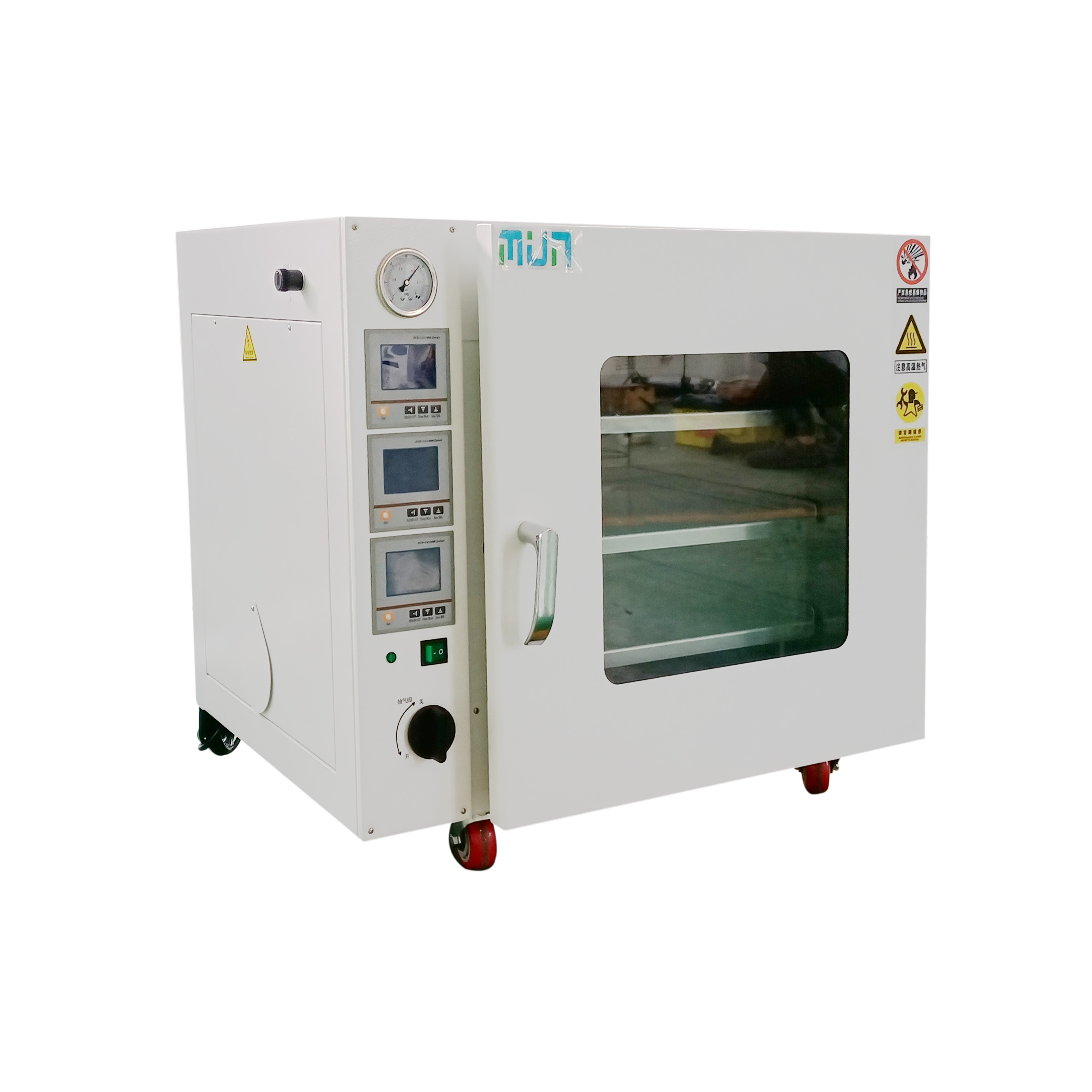 2. 工作室與玻璃門之間裝有一次性澆注成形耐高溫硅橡膠門封條有效密封,以保證箱內(nèi)達(dá)到較高的真空度。